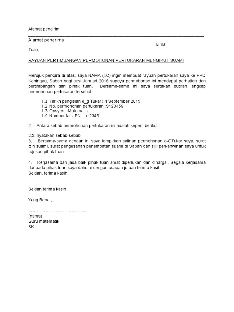 They are so many great picture list that could become your enthusiasm and informational purpose of Contoh Surat Sokongan Egtukar design ideas on your own collections. Pdf contoh surat rayuan eg tukar. Tajuk surat rayuan contohnya berbunyi RAYUAN SEMAKAN SEMULA PERMOHONAN PERTUKARAN DARI SMK XXXXX JOHOR KE NEGERI TERENGGANU BAGI SESI JANUARI 2019 Ketua unit menengah En sila rujuk laman web KPM atau Ketua unit rendah En sila rujuk web KPM Kenalkan diri nombor IC nombor siri pertukaran dari mana nak ke mana.