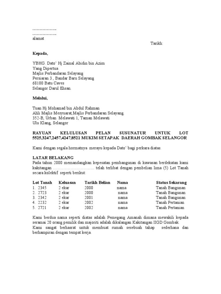 Contoh Surat Aduan Tanah It also will include a picture of a sort that could be seen in the gallery of Contoh Surat Aduan Tanah. Surat Rayuan biasanya digunakan untuk membuat permohonan buat kali keduaterdapat beberapa jenis surat rayuan yang kerap digunakan untuk membuat permohonan sepertirayuan memohon kursusprogrambiasiswa dan perkerjaan. Bkdkpp Taman Rengas Jaya Permohonan Surau Trj Pada.