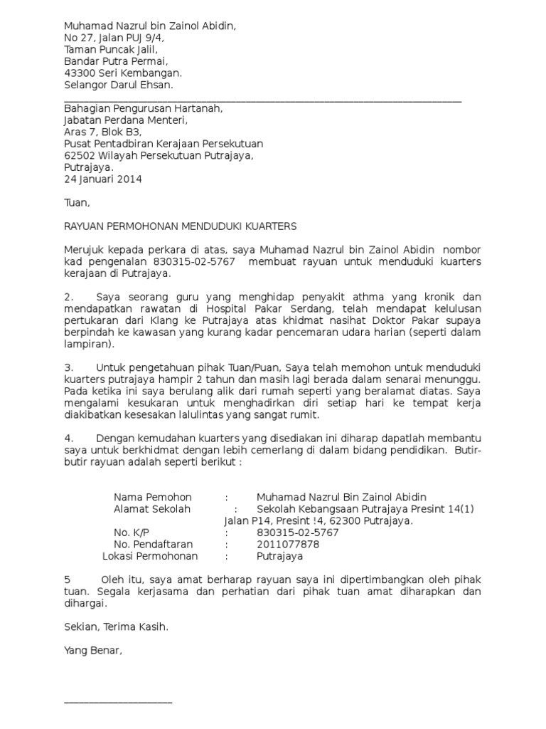 Surat Kiriman Tidak Rasmi Contoh Karangan Spm. Contoh Surat Kebenaran Menduduki Kuarters Tysonuti. Surat rayuan permohonan kuarters kerajaan contoh surat rayuan permohonan kuarters contoh surat rayuan permohonan rumah surat rayuan permohonan kuarters kerajaan surat rayuan permohonan pertukaran sekolah surat rayuan permohonan kerja surat rayuan permohonan tadika surat rayuan permohonan guru surat rayuan permohonan haji surat rayuan.