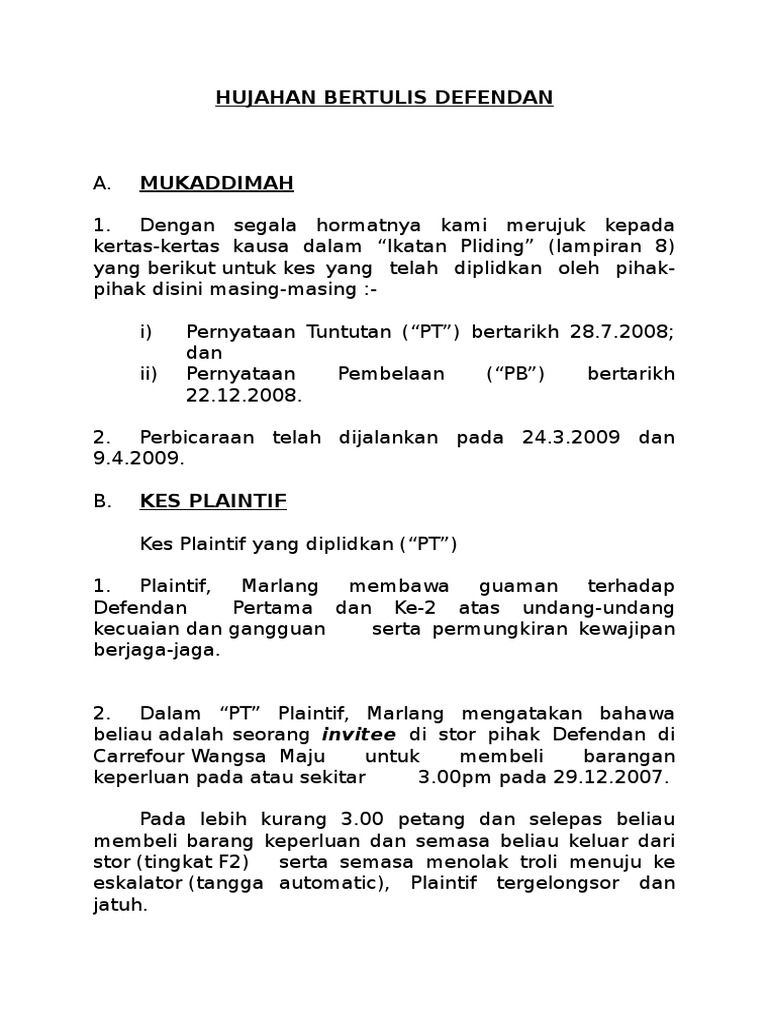 Hujahan ini difailkan oleh peguam bagi Plaintif MOHD ZAKUAN BIN MANSOR NO. Rantaian penyebaban tidak dipatah oleh doktor dan beliau tidak melakukan. Hujahan Bertulis adalah hujahan kita dalam bentuk karangan.